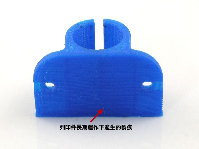 有一個名詞叫「金屬疲勞」,飛機或機械的金屬組件在長期使用下,會產生疲勞碎裂的現象,輕者就是機械故障,嚴重的會影響到航班的安全。同樣的情況也會出現在3D印表機上,特別是會隨著印表機運轉而被「操」的非常慘的特定列印件,通常都是第一個壞掉的。以Prusa i3來說,最容易壞的,就是在Y軸上夾住線性承軸並支撐列印平台重量的這個Bushing了。一次列印下來,Bushing滑動可能超過上萬次,承受的壓力與扭力當然很大。上圖就是朋友的Prusa i3上的Bushing,已經出現裂痕,結果夾不住線性承軸,在列印時讓線性承軸跑出來,發生列印平台在列印中歪掉的慘劇。