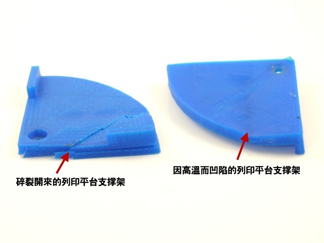 另一個比較容易出問題的部份,則是列印平台玻璃的支撐架,如果你有裝熱床的話就要很小心支撐架遇熱而出現凹陷的問題。因為中空或內部填料不足的支撐架,一旦遇到熱床的熱度,很容易就會出現變型。很快的,你的支撐架就會完蛋了,列印平台也會出現歪斜的問題。