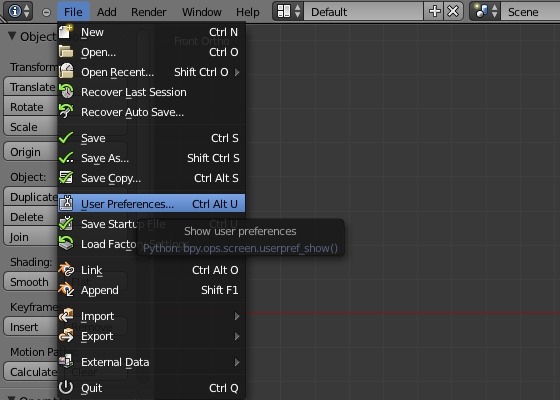 接下將分次示範如何用「一條龍全開源免費3D列印環境」印一個有自己車牌號碼的鑰匙圈,因為家中摩托車有好幾台,常常拿錯,所以打算印一個這種鑰匙圈。但在開始實作之前,要先介紹如何設定Blender的中文作業環境。這個軟體的簡介與下載請先參照部落格前文,要設定中文環境,請在打開軟體後,選「File」==>「User perferences」,如上圖所示。