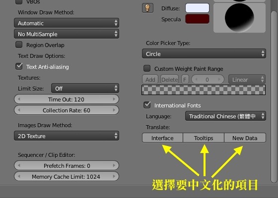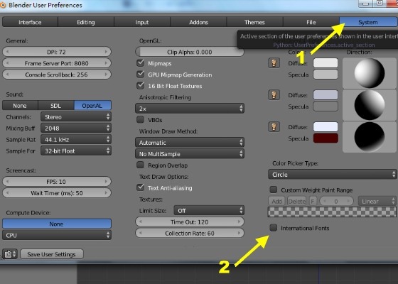 彈出User Preferences設定視窗後,先選擇「System」標籤頁,也就是「1」的地方,這時就會看到在這一頁的右下角有個International Fonts,就是「2」的地方,請將它勾選起來。