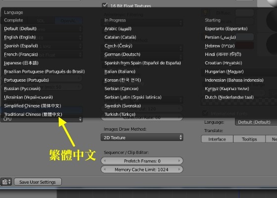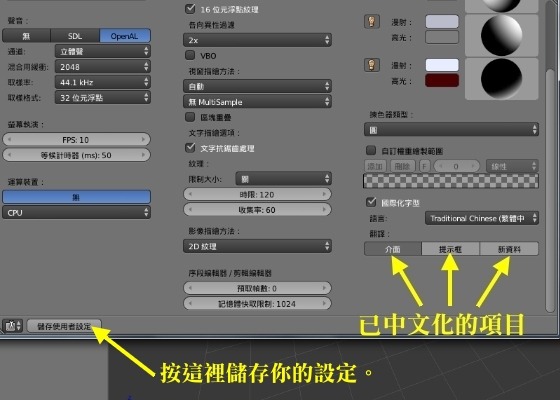 不過這樣的設定只有這一次有效,要讓以後開啟Blender時都是繁體中文介面,要先儲存設定。在同一設定頁面最左下角的位置,有個「儲存使用者設定」,給它按下去就大功告成了。