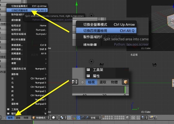 好,回到主視窗以來快來看看,是不是全部變成中文介面了,就先來試一個很重要的功能,請一定要記住,這在以後會很常用到,就是將單一視窗(全螢幕模式)切換成四個分割視窗模式。在「檢視」裡選「切換四視窗檢視」,主畫面就會跳成四個分割視窗的模式了,畫3D模型,四分割視窗是不可或缺的。