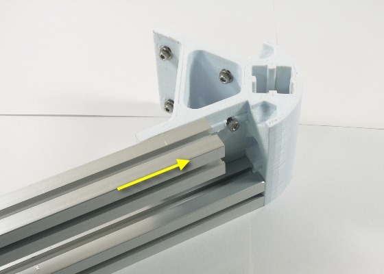 先把M3*10mm長的螺絲、墊片與螺帽如上圖旋好,但先不要鎖緊,螺帽不會掉下來就好。然後將240mm的鋁擠型依圖示方向推入即可,要注意的是列印件上的凸起條,要能剛好塞入鋁擠型的凹槽中,不過列印件難免有誤差,如果在組裝時發現塞不進去,記得要用銼刀先打磨一下,確定可以塞入後,即可依圖示方向順利推入。如果螺帽擋住鋁擠型而無法順利推入,就要把螺帽再旋鬆一點即可。