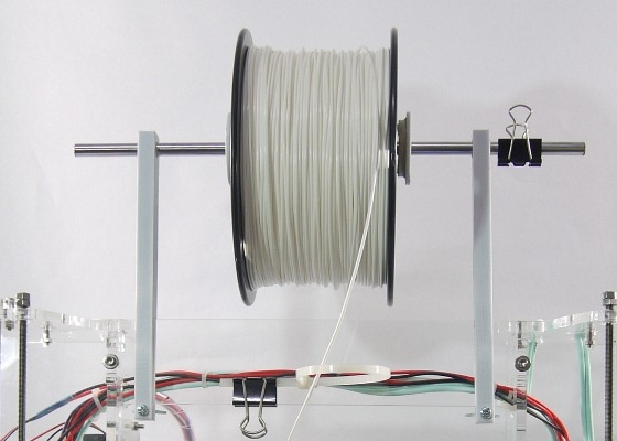 兩根支架的最下方有螺絲孔,可以鎖螺絲,建議螺帽使用蝴蝶螺帽,這樣要拆除更換線材會比較方便。這些東西去隨便一家五金行就可以買到,至於規格尺寸隨意,只要能鎖上固定好就可以了。支架上方的孔是設計給8mm光軸的,就是買X、Y、Z軸光軸時多買一根即可。如果沒有,去五金行買適合尺寸的條狀物即可,萬一找不到直徑剛好一樣的也沒有關係,直徑略小的話兩側用長尾夾夾住,不要讓線材捲軸掉出來就好了。